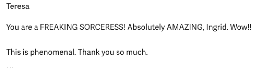 And if you need a little nudge - the last time I delivered a brand strategy doc, my client Teresa called me a "freaking sorceress." (Her words, not mine 😂) That's the thing about finally seeing your brand on paper, positioned and clear and actually strategic, it really hits different than you expect it to. |